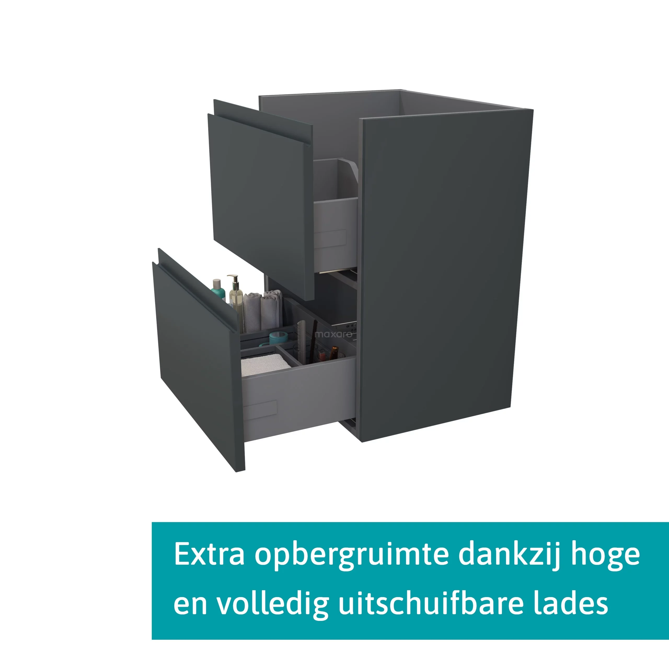 De onderkast is voorzien van 2 lades, waarin u plaats heeft voor al uw badkamerspullen. Door het softopen- en closesysteem openen en sluiten de lades geluidloos. Bovendien zijn ze extra hoog en volledig uitschuifbaar. Verder heeft het meubel een slimme sifonuitsparing. Hierdoor benut u de beschikbare ruimte optimaal.